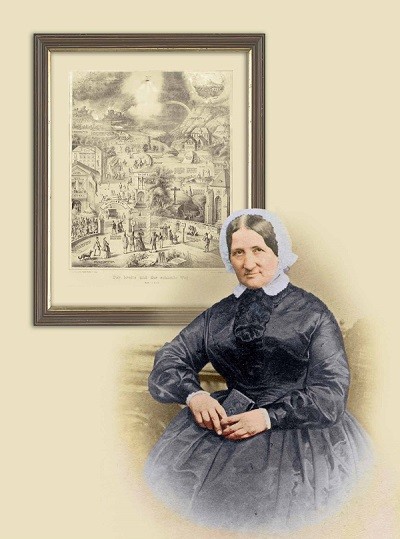 Dans la présentation faite par le MIR, on apprend que le concept de l’affiche a été élaboré par Charlotte Riehlen (1805-1868), pieuse protestante co-fondatrice de la Maison des diaconesses de Stuttgart. De la conception à la création proprement dite de l’affiche s’écoule une période de cinq ans, entre 1862 et 1867, date de la première impression. Le British Museum, dans son commentaire de l’œuvre, attribue la réalisation de l’illustration en noir-et-blanc à Herr Schacher, jeune artiste de Stuttgart (1). Cette source propose une orthographe différente de la conceptrice, Charlotte Reihlen, à partir de l’orthographe allemande. Le Musée d’Etat de Welzheim propose les mêmes informations dans sa présentation de l’œuvre et spécifie le rôle clef de Conrad Schacher (1831–1870), lithographe, dans la mise au point de l’affiche. Celle-ci ne circule au départ qu’en noir-et blanc, comme on peut la découvrir sur un portrait fait par Peter Millward, à titre posthume, de Charlotte Reihlen à partir de deux photographies distinctes. Ce n’est qu’en 1890 que le peintre allemand Paul Beckmann (1846–1919) réalise ensuite l’estampe en couleurs, telle que nous avons l’habitude de la rencontrer encore aujourd’hui.
