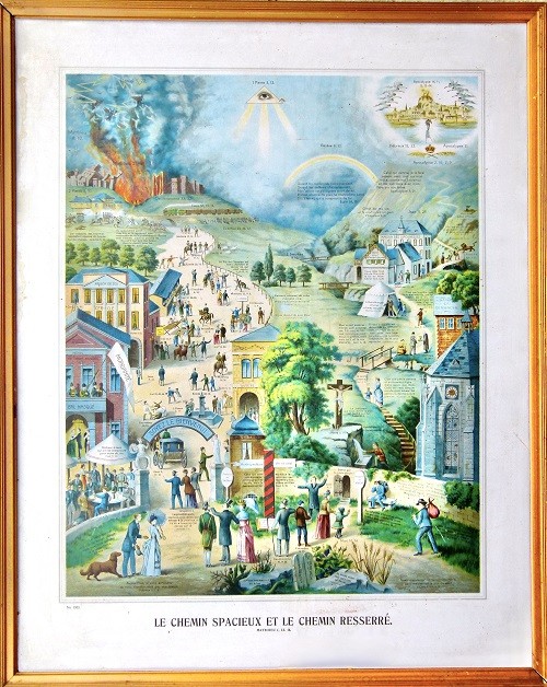 Rapidement, la popularité de la version allemande, réimprimée de multiples fois, franchit les frontières nationales et linguistiques. On traduit l’estampe en néerlandais, l’éditeur H. de Hoogh se chargeant de la vendre à 10.000 exemplaires, puis en anglais (2), mais aussi en français, et dans d’autres langues. Depuis la fin du XIXe siècle, la francophonie protestante s’est ainsi enrichie d’un de ses plus emblématiques supports de piété privée protestante. De légères variantes existent, le titrage a pu changer (tantôt Le chemin large et le chemin étroit, tantôt Le chemin spacieux et le chemin resserré), mais une constante reste : à la manière des ouvrages pédagogiques de l’époque (3), on illustre à hauteur d’homme et de femme le choix spirituel que le christianisme invite à effectuer, entre salut et perdition, « chemin large » (vers la perte) et « chemin étroit » (vers le salut).